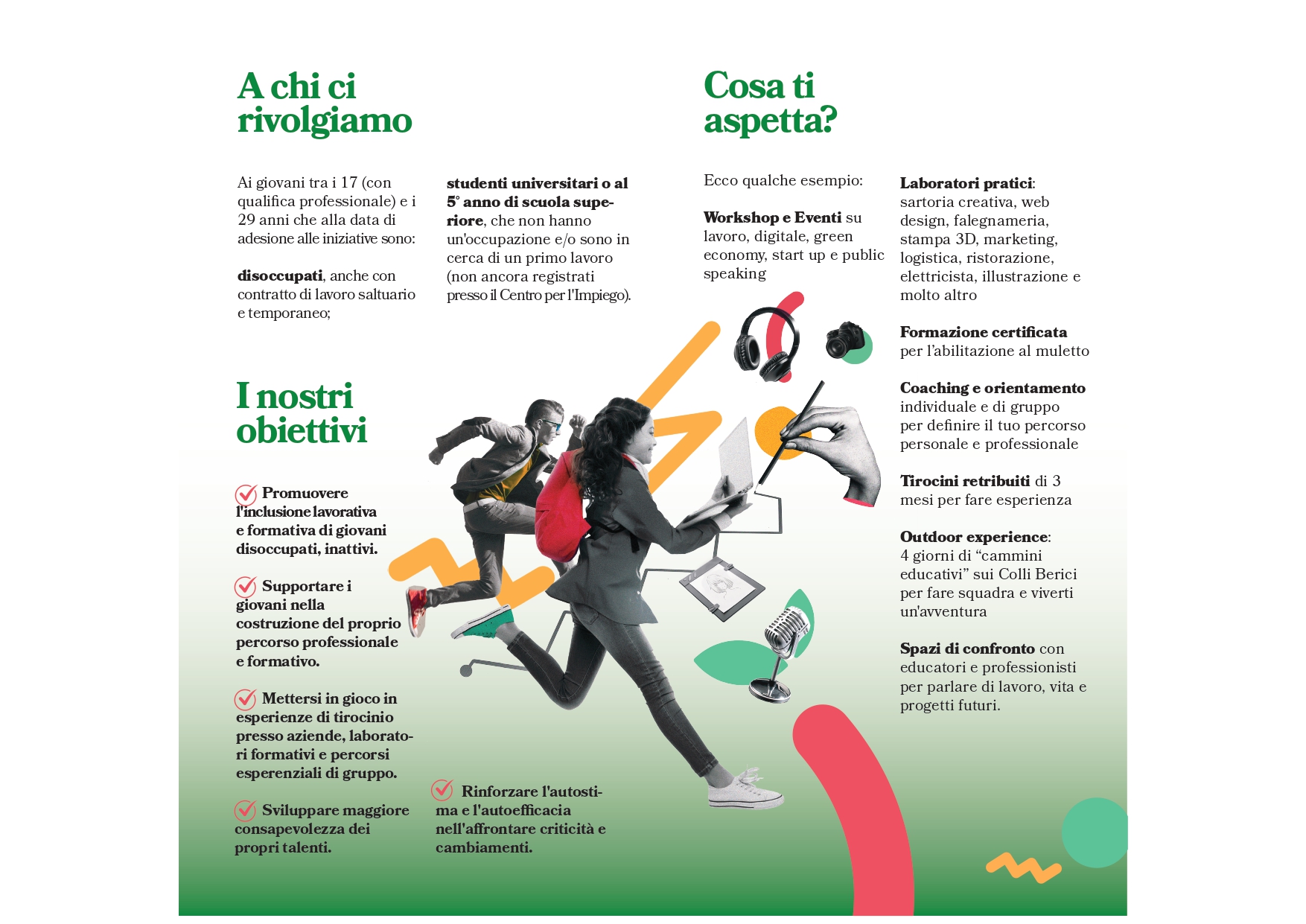 • Età compresa tra i 18 e i 35 anni con priorità ai giovani di età compresa tra i 18 e i 29 anni: inoccupati/disoccupati/neet/ inattivi, studenti del 5° anno di scuola superiore/ studenti universitari/working poor che non hanno ancora definito un progetto di vita-lavoro,